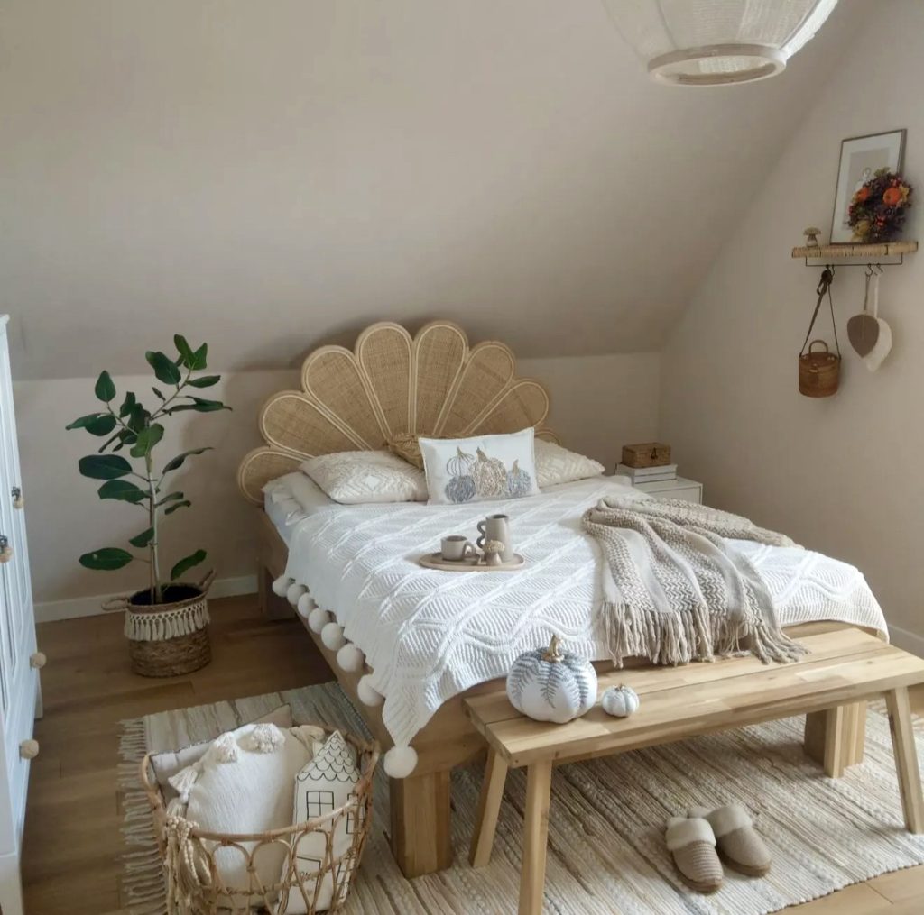 This peaceful setup captures the charm of Japandi and bohemian design—a mix of calm minimalism and handcrafted detail. The rattan headboard, soft white textiles, and woven baskets enhance a feeling of natural serenity. A light wood bench and gentle neutrals keep the interior bright and balanced. Small touches like cozy slippers and neutral throws add to the room’s welcoming energy. It’s ideal for ideas for kids or ideas for couples who love earthy tones and relaxed, stylish living.