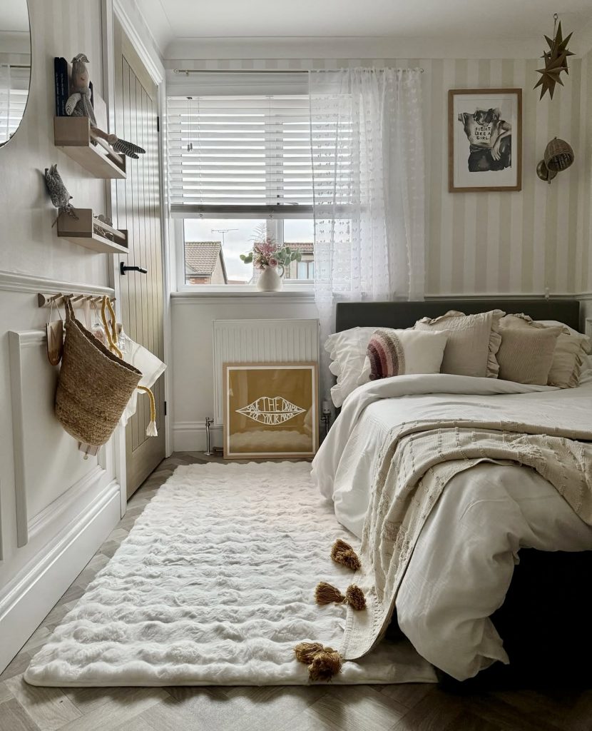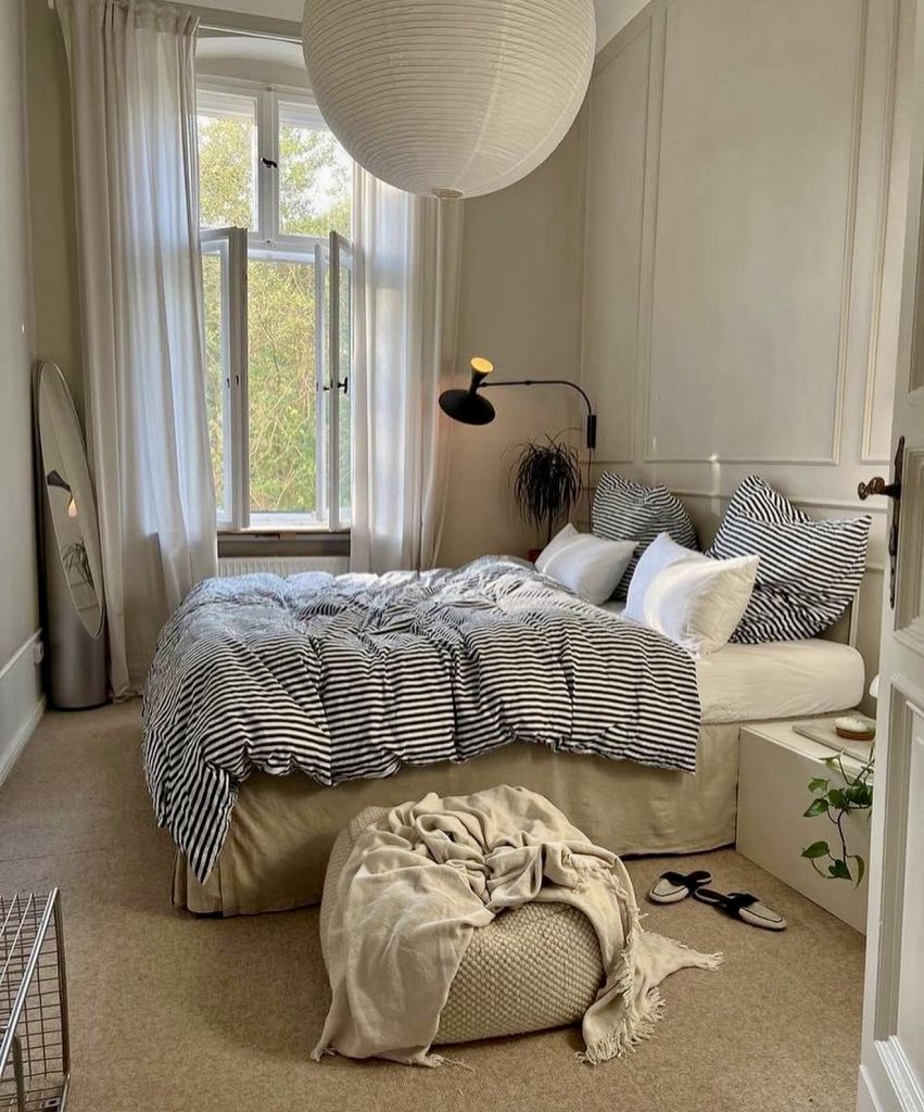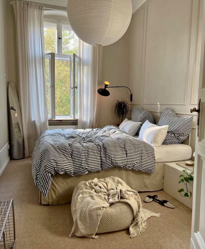 This small bedroom blends classic charm with modern design, showing how stripes can elongate and energize compact spaces. The tall window and sheer curtains ensure abundant natural light, brightening the aesthetic palette of neutrals and soft grays. A knitted pouf and throw blanket bring tactile comfort, reflecting clever cozy ideas that work in any small apartment. The black wall lamp adds a contemporary touch while saving surface space. For those seeking room ideas that mix character with comfort, this one strikes the perfect balance.