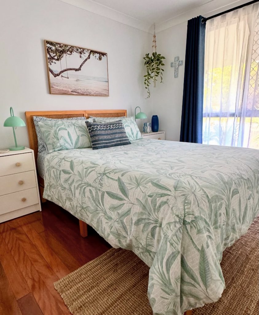 This sunlit bedroom brings the feeling of a coastal escape with its palm-print bedding and soft green hues. Light wood furniture and woven accents add warmth while maintaining a fresh aesthetic. The hanging plant and ocean-inspired art complete the look, showing how nature can elevate interior design effortlessly. It’s a simple, airy layout perfect for small spaces in need of calm and color. These decor ideas reflect a tropical modern vibe that feels timeless and rejuvenating.