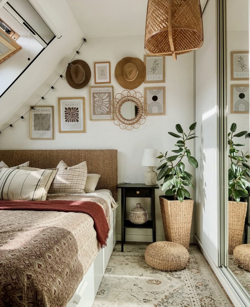 This bright attic bedroom uses angled ceilings to its advantage, embracing clever layout ideas for small, sloped spaces. Natural textures, woven baskets, and framed art give the decor an organic and balanced touch. The mirrored wardrobe amplifies light, creating an illusion of openness and smart organization. Layered bedding and soft lighting make the atmosphere effortlessly cozy and restful. It’s the perfect inspo for anyone transforming a compact loft into a peaceful retreat.