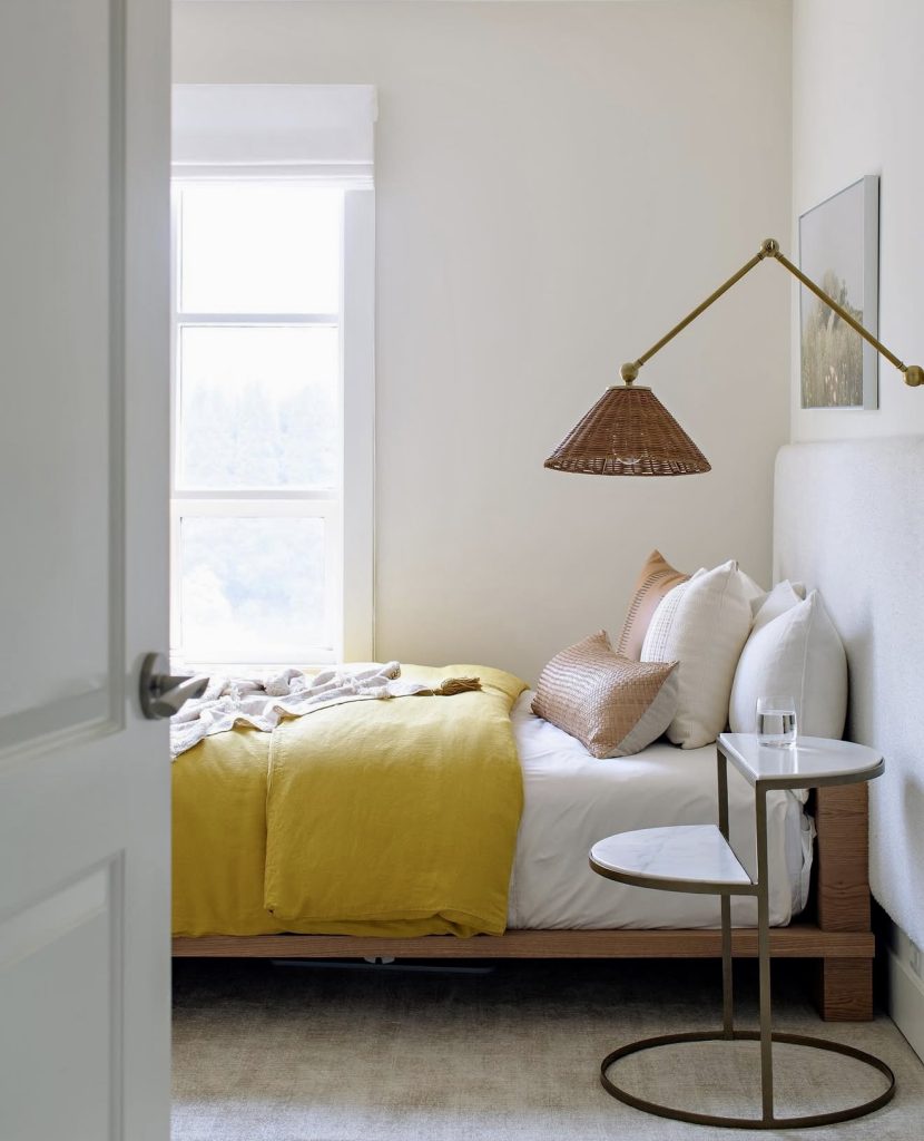 Merged with warm mustard and neutral tones, bedding and airy bedroom ambience maintain a clean and spacious feel. A wall sconce in precious metal adds soft character and harmonizes with balance, aiding in conserving floor space. Each element having clear intention and balance in decor and space, with simple framed artwork, adds focus. This room, ideal for modern couples or singles, feels cozy and sharp in contemporary style. It showcases mastery in design through understated contrasts, which amplify the room’s simplicity.