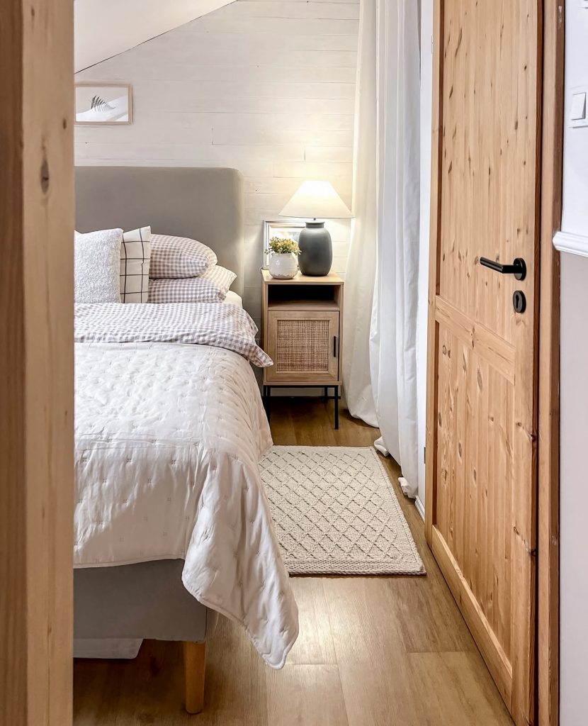 This small bedroom combines Scandi calm with rustic warmth through soft lighting and natural wood tones. The woven nightstand and neutral bedding reflect thoughtful design ideas that highlight texture and comfort. Pale walls open up the layout, making the room feel airy and larger than it is. The overall vibe suits ideas for teens or guests, offering cozy privacy with timeless charm. It’s a welcoming take on cozy room decor that’s both simple and stylish.