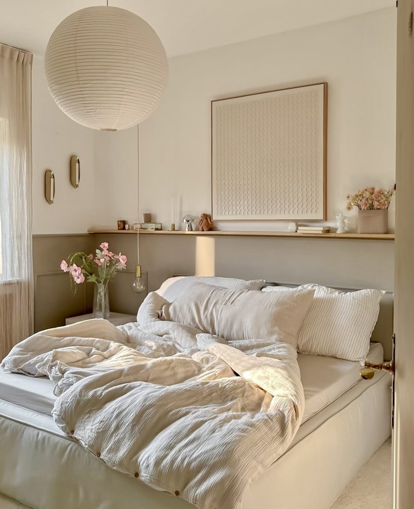 Here, interior design meets pure calm, with soft beige tones and layered linens that invite slow mornings. The floating shelf acts as both a storage idea and a decorative statement, keeping essentials within easy reach. This balanced layout embodies the 2026 trend toward intentional simplicity inspired by Japandi harmony. Gentle lighting enhances the feeling of intimacy, perfect for ideas for couples who value peace over excess. Every detail feels curated, proving that a minimalist space can still be deeply personal and very cozy.