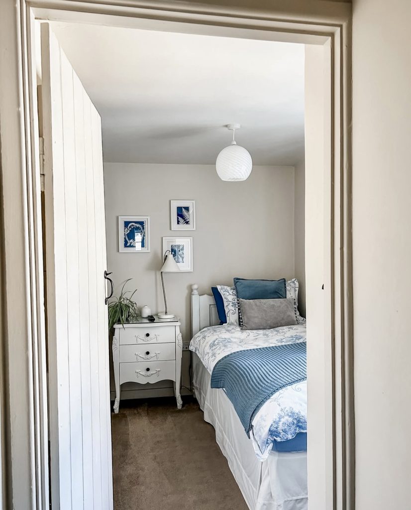 This compact bedroom showcases timeless charm with crisp blue and white tones that feel both refreshing and polished. The mix of vintage furniture and layered textiles creates a sense of balance and organization. The small layout feels open thanks to strategic use of vertical lines and cohesive colors. It’s an elegant example of interior design that suits both traditional and coastal tastes. Perfect for ideas for couples who love classic comfort with a modern twist.