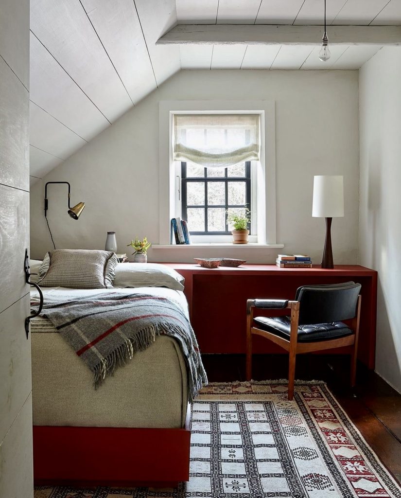 This attic bedroom combines traditional charm with contemporary interior design elements. The deep red furniture brings warmth and depth, contrasting beautifully with neutral bedding and a patterned rug. A well-placed desk doubles as a workspace and storage idea, showing how clever layout ideas can make the most of limited space. The gold reading light adds a refined, retro touch that enhances the cozy atmosphere. It’s a smart example of modern rustic balance—minimal yet full of personality.