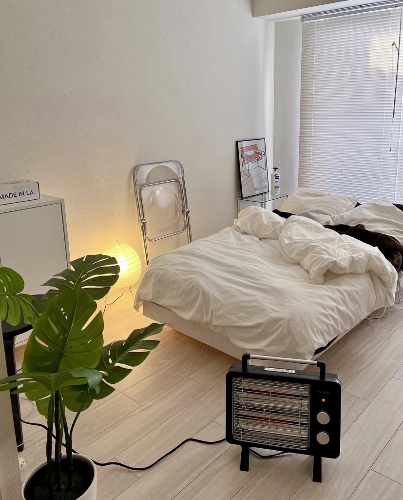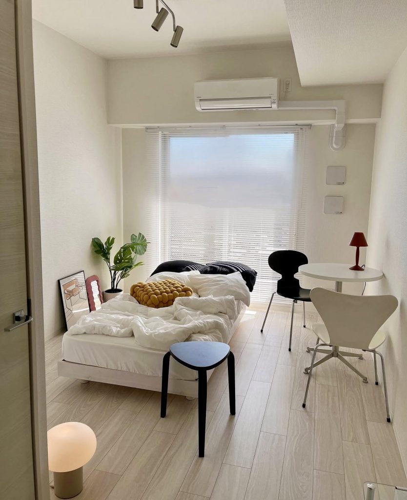 This minimalist bedroom captures the quiet beauty of everyday living with light flooring and uncluttered decor. A single potted plant and sculptural lighting add warmth without compromising simplicity. The low bed frame enhances the sense of openness—a clever layout idea for small city apartments. Soft, neutral bedding reinforces calm, while the subtle details reflect refined design sensibility. It’s proof that small spaces can feel expansive with the right interior balance.