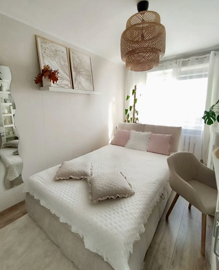 Soft pink tones and gentle textures define this delicate yet inviting bedroom. The woven pendant and layered bedding create a sense of cozy room decor that feels calm and timeless. Vertical mirrors and minimal furniture enhance the organization, making the most of every inch. This space shows that elegant design ideas don’t require large square footage—just thoughtful curation. Perfect for cozy ideas that blend softness with simplicity.