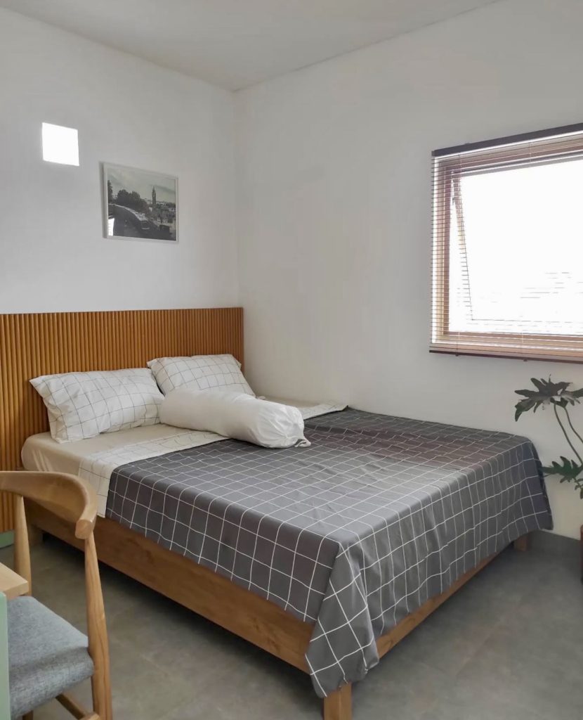 This small yet structured bedroom highlights the power of clean geometry and warm wood. The grid-patterned bedding adds visual rhythm, while the vertical headboard creates subtle architectural depth. Natural light and minimal furniture keep the layout uncluttered, ideal for ideas for teens or minimalist enthusiasts. Touches of greenery soften the lines and bring nature indoors. It’s an excellent example of practical interior design that balances order and comfort.