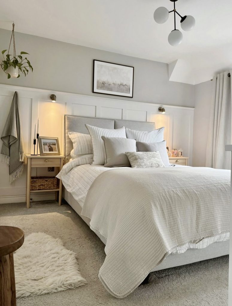 This timeless bedroom design showcases an elegant layout where clean lines and warm lighting create an inviting atmosphere. The paneled wall and built-in sconces add architectural depth, while layered bedding enhances the sense of softness. Small details like the hanging plant and framed art express mindful decor without crowding the room. This design suits both singles and ideas for couples who crave modern coziness. It’s a gentle reminder that interior calm begins with thoughtful composition and balance.