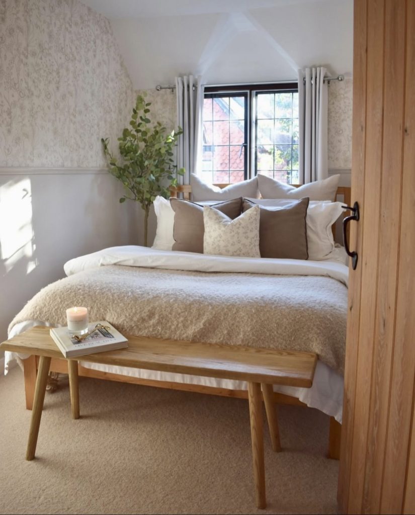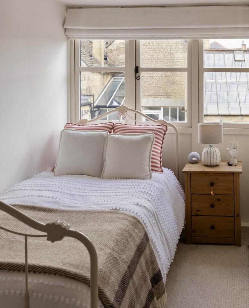This charming room embraces small bedroom layout ideas inspired by English cottage aesthetics. The crisp white bedding with textured details brings a sense of calm, while the red-striped cushions add a pop of warmth and nostalgia. A natural wood nightstand provides both character and functional storage ideas, perfect for those seeking cozy room decor without clutter. The simplicity of the design allows the architecture and natural light to shine. It’s an ideal inspo for anyone living in a historic or compact home who values comfort and authenticity.