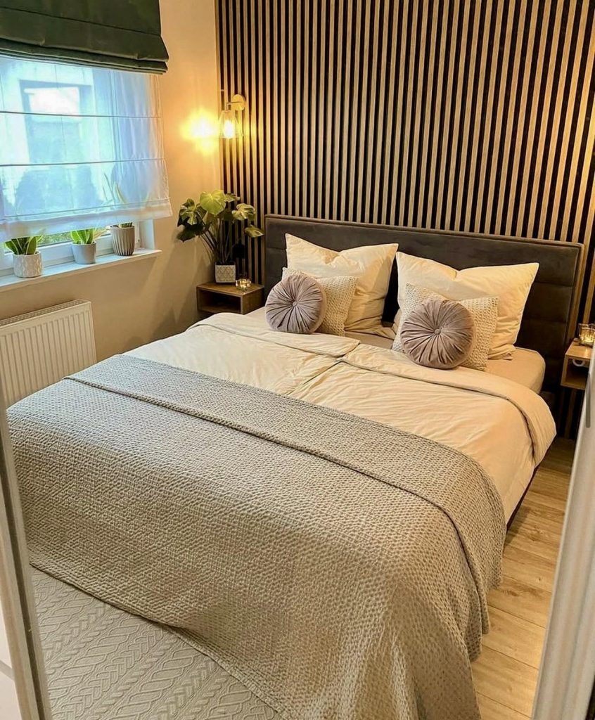 A striking wood accent wall instantly defines this room, showing how design ideas can make a small space feel bold yet sophisticated. The vertical paneling draws the eye upward, adding height and architectural rhythm. Paired with warm lighting and layered bedding, the decor feels refined yet approachable. The color palette of soft taupe and muted gold provides a luxurious feel that remains very cozy. This look is perfect for those who want a statement makeover without sacrificing comfort or function.