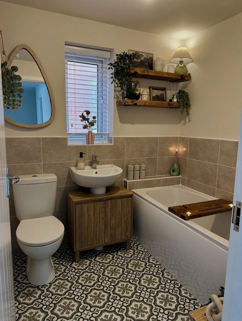 This small full bathroom shows how a warm, rustic-modern style can bring character to a tight space while still feeling calm and balanced. The patterned tile floor adds personality while also supporting the Ideas grey and Ideas color themes that make the space visually dynamic without overwhelming it. A compact tub surrounded by soft beige tiles proves that ideas with tubs in small layouts can feel both functional and spa-like. Open wooden shelving provides charming storage ideas, especially when paired with greenery and simple accessories that reflect a natural aesthetic. This setup is ideal for anyone seeking farmhouse vintage ideas that still blend seamlessly with modern convenience.