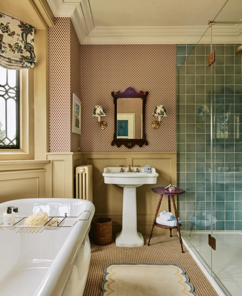 This charming bathroom blends traditional wallpaper with soft blue tile to create a layered look perfect for small-space ideas rooted in vintage character. The classic pedestal sink keeps the footprint light and supports a functional layout without adding unnecessary bulk. A freestanding Tubs offer inspiration for homeowners seeking ideas with tub decor that feel charming rather than overly ornate. Warm brass accents add just the right amount of elegance, enhancing the overall Ideas decor while keeping the room inviting and practical. This space beautifully demonstrates how eclectic textures can coexist in a compact full bathroom without overwhelming the design.