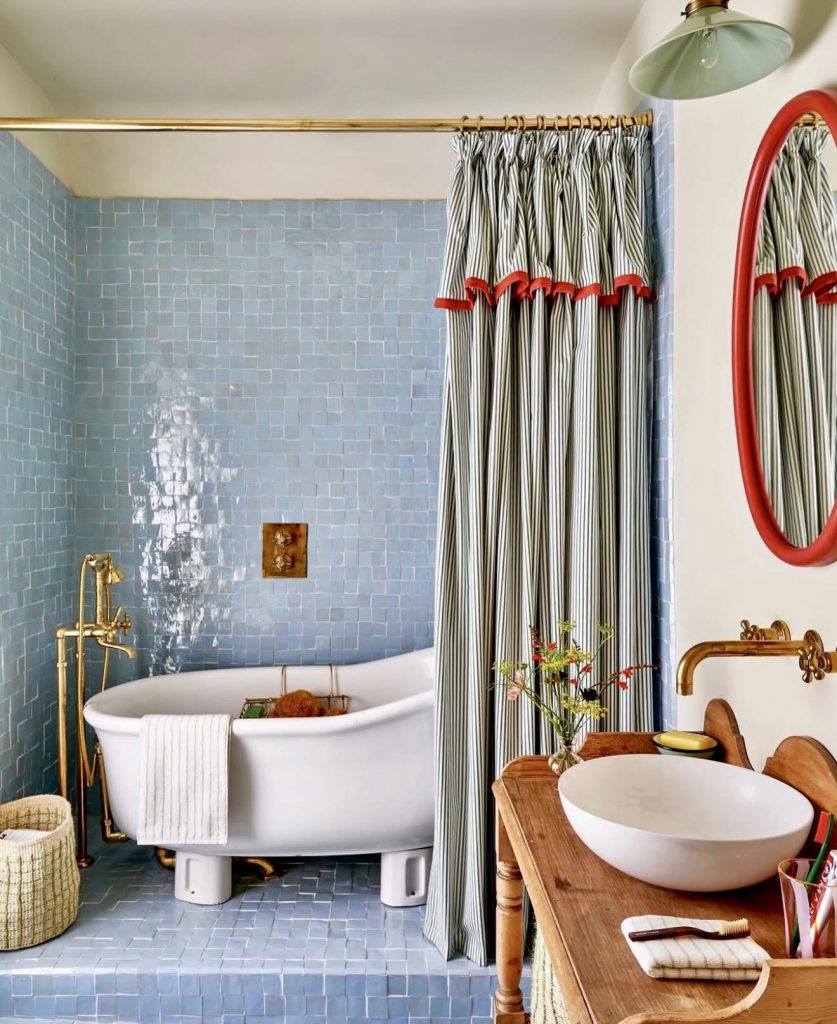 This cottage-inspired bathroom uses glossy blue tiles to introduce fresh ideas of color while highlighting the cozy charm of a freestanding tub. The raised platform creates a natural separation within the small room, offering smart layout benefits that help define functional zones. Striped curtains add personality and movement, reflecting 2026’s love for soft, textile-driven decor elements. The warm brass fixtures balance the cool palette and elevate the space with a touch of vintage sophistication. This design works well for those exploring ideas with tubs that feel both playful and timeless.
