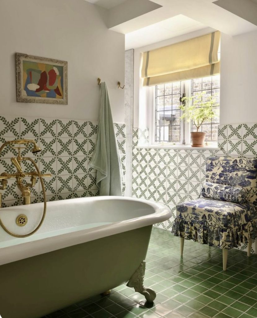 This small full bathroom plays with botanical tile patterns that introduce subtle ideas of color while maintaining a soothing, natural aesthetic. The clawfoot tub acts as the focal point and is ideal for homeowners considering a remodel with tub solutions grounded in traditional design. A comfortable printed chair adds charm and points to the growing 2026 trend of integrating soft furnishings as part of thoughtful Ideas decor. The green tiled floor ties the room together and showcases how strategic design choices can make a compact space feel intentional and visually cohesive. This setup is perfect for anyone who wants a warm, lived-in look that still offers modern practicality.