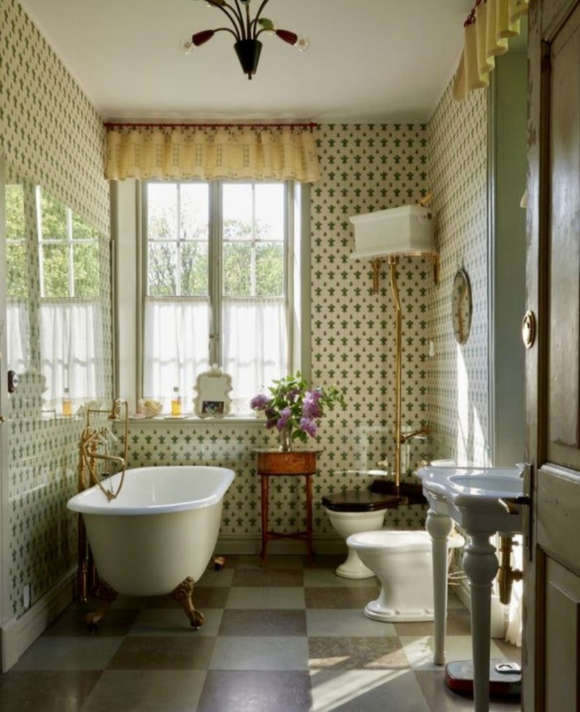 This bathroom combines patterned wallpaper, mid-century lighting, and a clawfoot tub for a nostalgic yet elegant take on small-space ideas. The checkerboard floor is a standout feature and supports unique layout possibilities by adding visual structure to the room. A high-tank toilet introduces distinct ideas of farmhouse vintage charm, blending seamlessly with brass fixtures and soft natural light. Decorative details like florals and framed art deepen the room’s story, making it a strong example of curated Ideas decor. For homeowners leaning toward a heritage-inspired remodel, this space offers timeless direction.