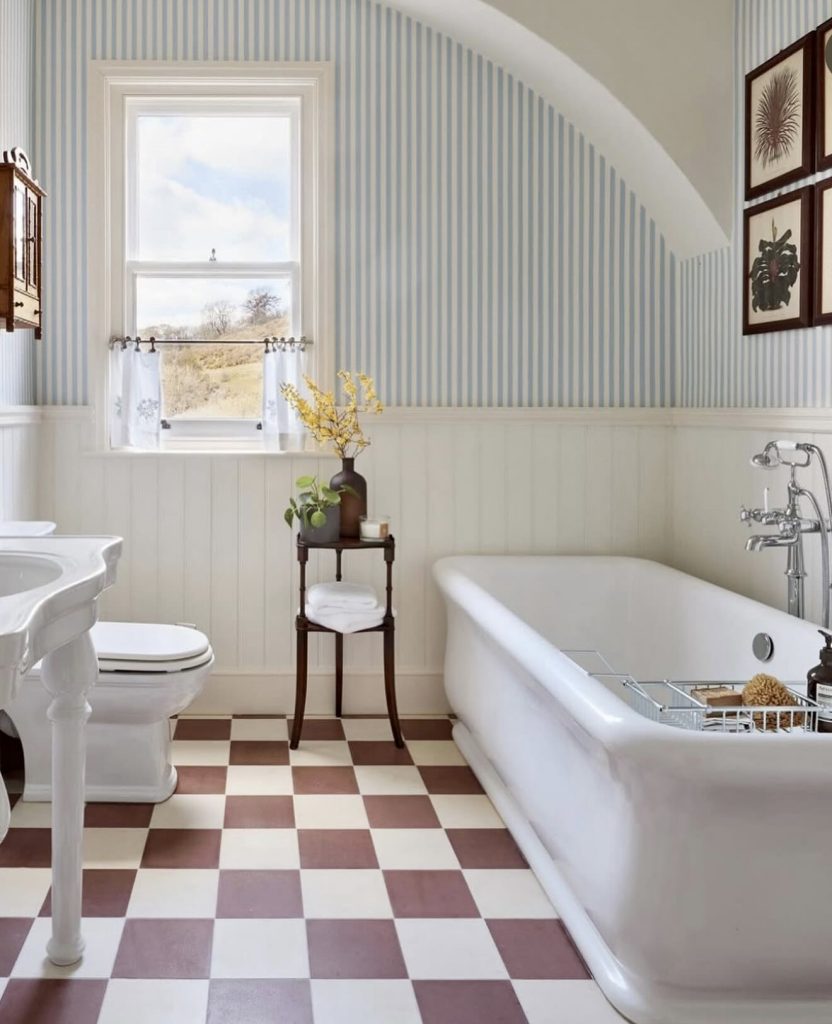 This fresh bathroom pairs striped wall treatments with a deep, sculptural tub, offering clean and uplifting ideas and white inspiration for small full bathrooms. The checkered flooring introduces graphic interest and smartly anchors the layout, making the space feel balanced and airy. A small wooden stand near the tub highlights simple yet effective storage ideas for compact rooms. Soft natural light enhances the overall design, proving how even minimal decor choices can shape the atmosphere of a small space. This look is ideal for fans of traditional American styling seeking ideas with tubs that feel bright, simple, and timeless.