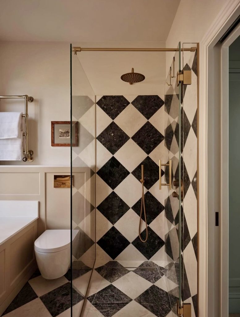 16. Checkerboard Marble Shower with Warm Brass Accents
