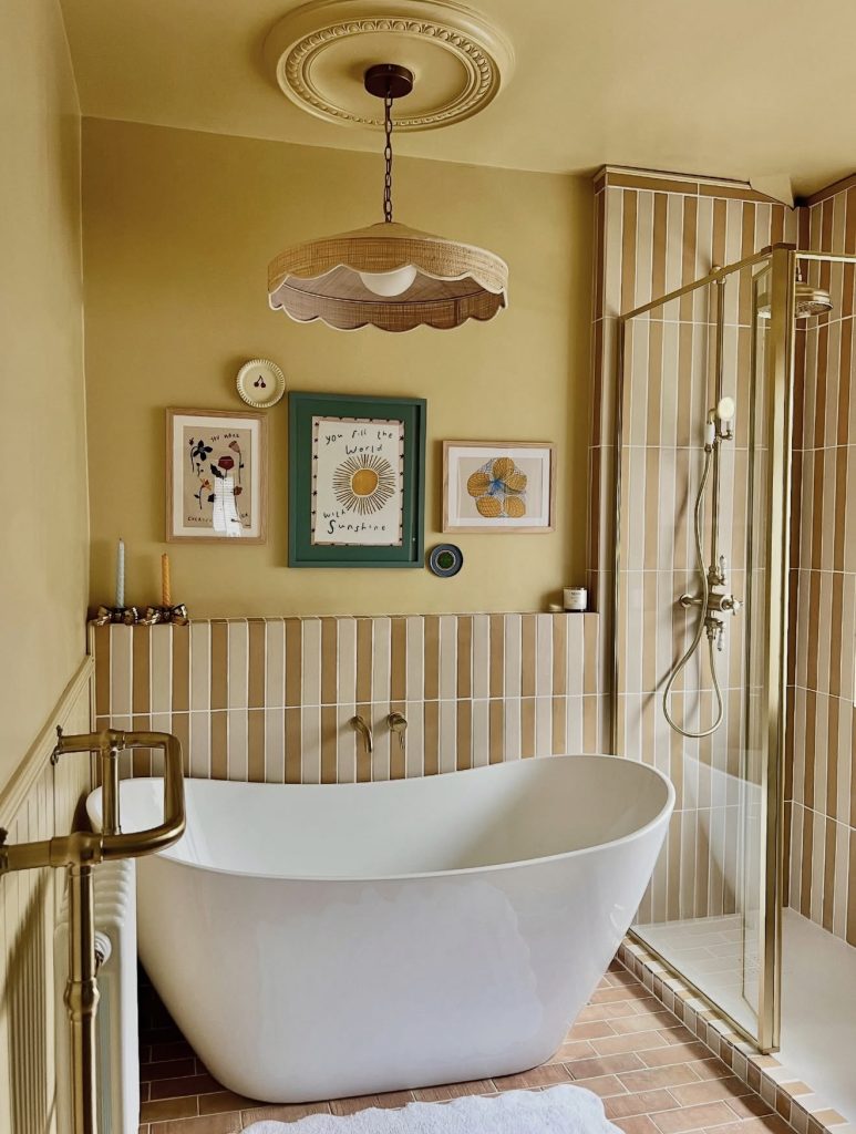 This cheerful bathroom embraces soft golden tones and vertical tile lines that elongate the room, offering clever design ideas for small full spaces. A sculptural freestanding tub creates a soothing focal point and is perfect for homeowners exploring ideas with tubs in warm and colorful palettes. Playful artwork and a scalloped pendant bring personality, showcasing how Ideas decor can turn a simple layout into a charming retreat. The warm brass shower fixtures tie the elements together while maintaining a cohesive aesthetic. Overall, this space provides approachable ideas for those wanting a cozy yet stylish bathroom refresh.