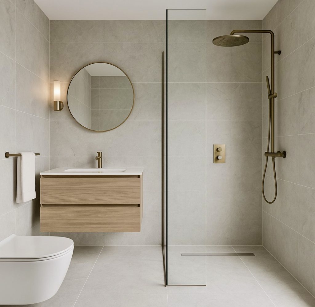 This minimalist bathroom embraces soft grey tones and uninterrupted surfaces, emphasizing functional elegance perfect for modern remodel projects. The floating vanity frees up floor space and supports practical layout strategies that make small rooms feel more expansive. A sleek walk-in shower setup with brass hardware adds a subtle warmth to the cool palette. The round mirror and simple lighting create a serene environment ideal for homeowners who prefer uncluttered design. This bathroom highlights how simplicity can still achieve a high-end look in a compact footprint.