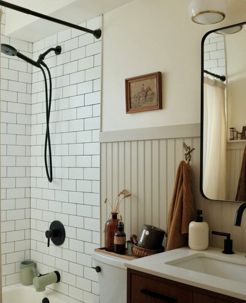 This design captures the timeless charm of white subway tile while introducing matte black accents that elevate the entire design. The sleek fixture choices demonstrate how ideas with showers can feel bold and modern without taking up additional space. Warm neutral beadboard adds dimension and proves that Ideas decor can stay subtle while still shaping the room’s atmosphere. The thoughtful layout places essentials efficiently, offering inspiration for those seeking ideas from the UK or urban American aesthetics with a handcrafted touch. This space also highlights how small bathrooms can embrace remodeling ideas without losing their character.
