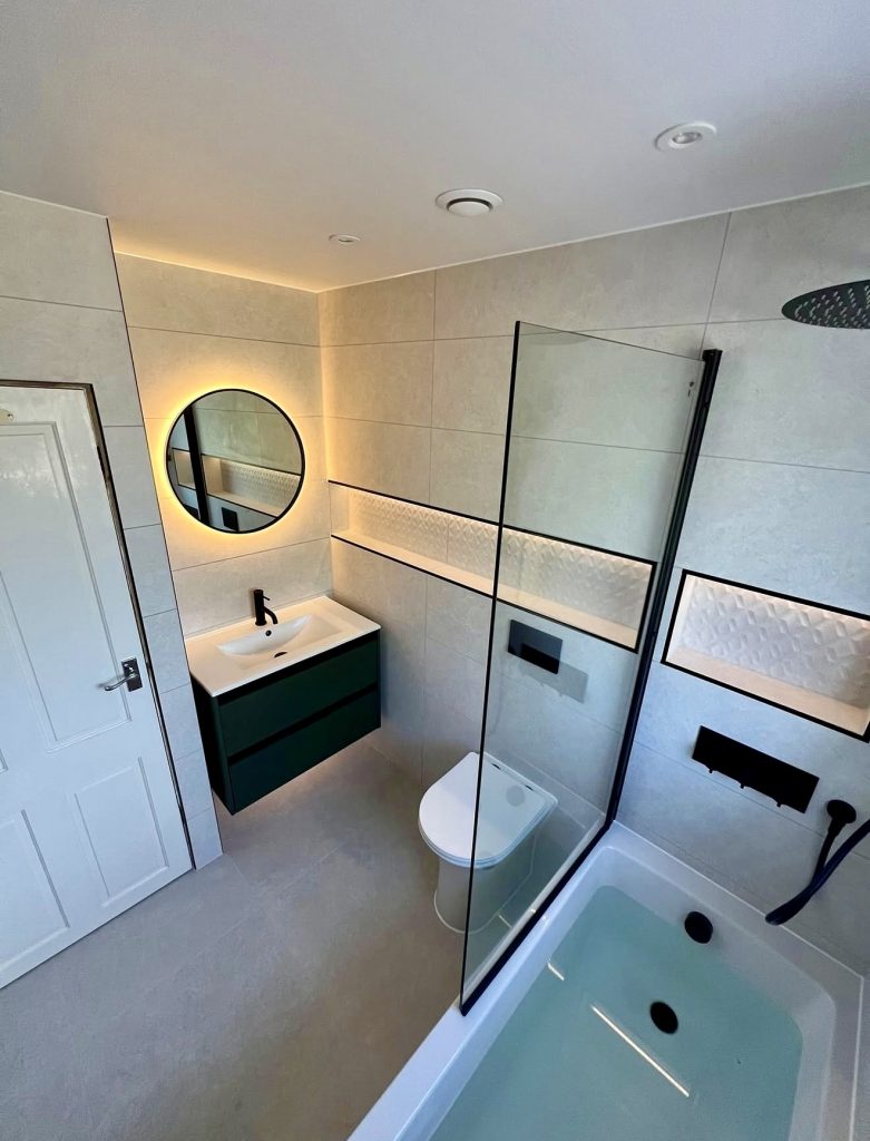 This sleek bathroom combines warm lighting, soft tiles, and clean lines to create a bright and modern aesthetic ideal for practical ideas with tub shower combo layouts. The illuminated mirror adds depth to the room, contributing to a clever design that makes small spaces feel more open and inviting. Black fixtures offer subtle contrast and support modern decor trends that continue to rise in 2026. The partial glass screen maintains openness while creating a functional shower zone for families wanting versatility. This bathroom is an excellent example of how thoughtful remodel choices can elevate even the smallest full bathroom.
