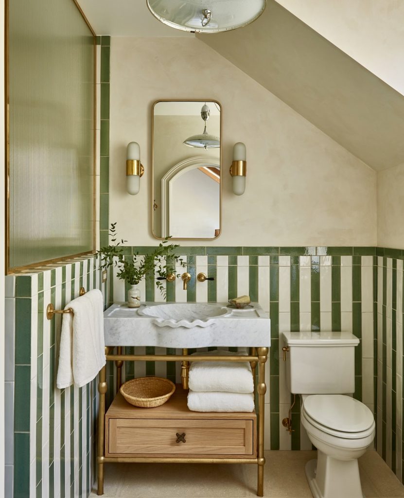 This charming small bath blends soft neutrals with vertical green tile for a look that feels both calming and stylish—exactly the kind of design direction that has been gaining traction for 2026. The narrow layout makes clever use of wall-mounted brass fixtures and a compact marble vanity, freeing floor space while giving the room a more luxurious feel. Homeowners looking for ideas for decor inspiration can take note of how the warm metals balance the cool green palette without overwhelming the room. The half-tiled walls also make a smart choice for those exploring renovation upgrades in tight quarters, as they add visual height while keeping maintenance simple. Even the open vanity shelving offers subtle storage ideas that maintain the airy cottage character.