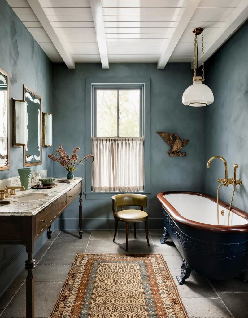 This atmospheric bath embraces rich teal plaster walls and vintage-inspired finishes, creating a dramatic yet inviting backdrop—perfect for anyone searching for ideas with tub inspiration. The freestanding cast-iron tub with its deep navy exterior feels timeless and anchors the room with sculptural depth. For homeowners interested in farmhouse vintage ideas, the mix of antique rugs, aged brass, and a traditional washstand shows how older elements can shine in a modern remodel. The long, narrow room demonstrates a thoughtful layout of ideas, using a centered window and slim furniture to keep the space balanced. It’s a great reminder that bold ideas and color choices can still work beautifully in small full bathrooms when paired with classic silhouettes.