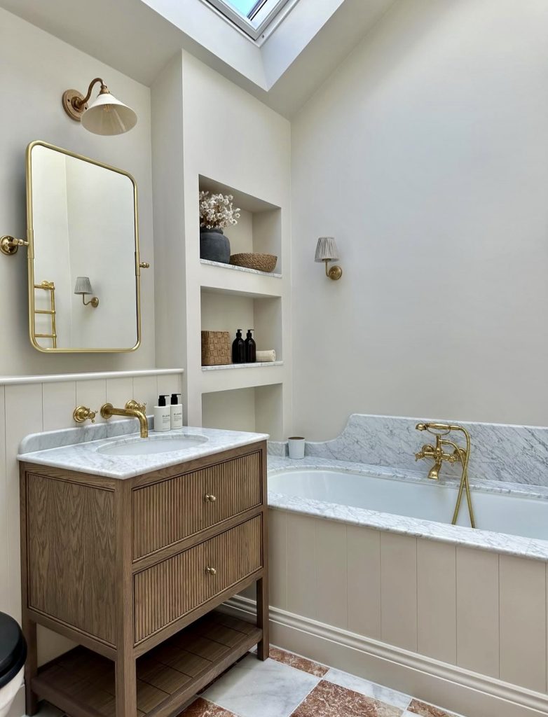 This serene bathroom showcases how soft neutrals, warm brass finishes, and natural wood can come together for a quietly luxurious retreat, especially appealing for homeowners seeking modern ideas with tub solutions. The built-in shelving creates a seamless architectural moment while doubling as refined storage ideas, keeping essentials organized without clutter. The marble-wrapped tub surround adds polish and longevity, making it a standout example for those researching remodeling with tub upgrades. The gentle palette works well for anyone wanting white ideas that still feel layered and textured rather than plain. Altogether, this space reflects a design-forward yet approachable approach to small bath renovation.