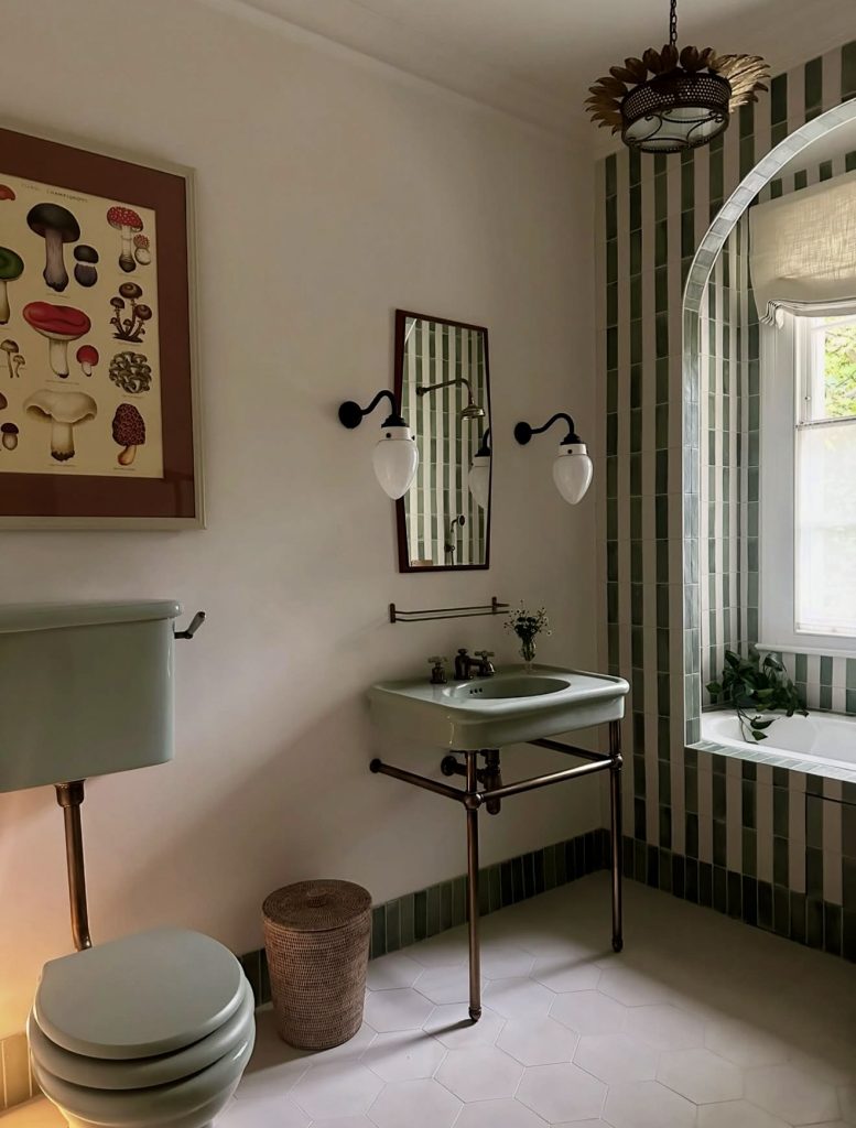 This character-rich bath embraces sage green fixtures and vertically stacked tile, offering inspiration for homeowners craving farmhouse charm with a modern twist. The built-in tub niche framed by arched detailing brings a nostalgic sense of warmth that fits perfectly into the rising Ideas farmhouse vintage trend. The muted palette doubles as a smart guide for those hunting for subtle ideas and color combinations that still make a statement in a small space. Slim metal legs under the sink keep the footprint light, ideal for anyone reworking a compact layout without sacrificing style. The overall aesthetic balances whimsy and elegance, making it a thoughtful reference point for bath design in 2026.