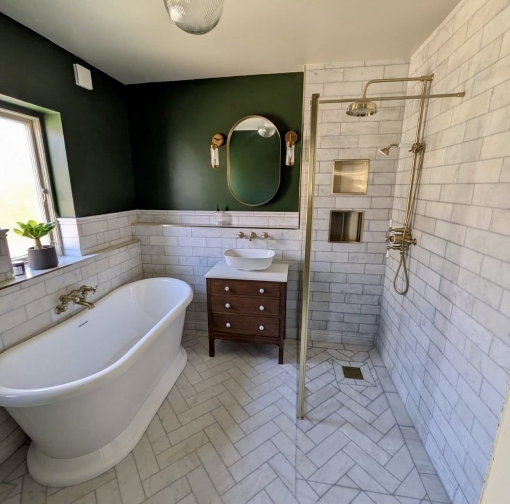 This bathroom blends deep green walls with marble-inspired tile for a sophisticated take on modern ideas with a tub. The freestanding A tub makes a statement and shows how even small rooms can integrate ideas with tub tile to elevate the overall mood. Soft brass hardware warms the palette and supports design directions popular in 2026, where metal finishes subtly anchor the room. The efficient layout connects the vanity, tub, and shower zone without visual clutter, maximizing floor area. For homeowners who enjoy a bit of drama, this setup delivers black ideas in a tasteful, polished way.