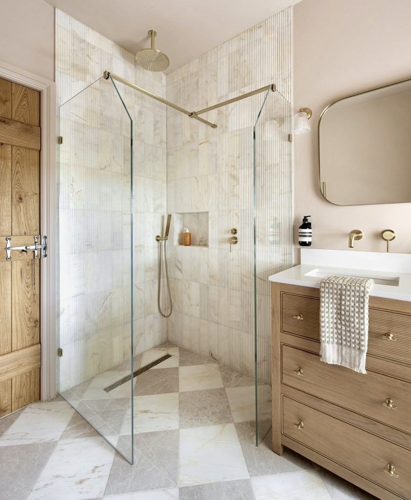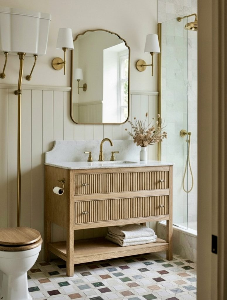 This bathroom blends soft geometric tiles with warm brass accents for a fresh take on small-bathroom ideas with showers in 2026. The vanity’s marble top introduces gentle off-white tones while maintaining a cohesive palette with the rest of the room. A clean glass enclosure keeps the layout open, allowing natural light to flow through the shower and brighten the full space. Decorative sconces and a bead-trimmed mirror add charming decor details that make the room feel personal rather than purely functional. This design is a perfect fit for homeowners inspired by refined ideas and remodel styles that balance modern comfort with elegant finishes.
