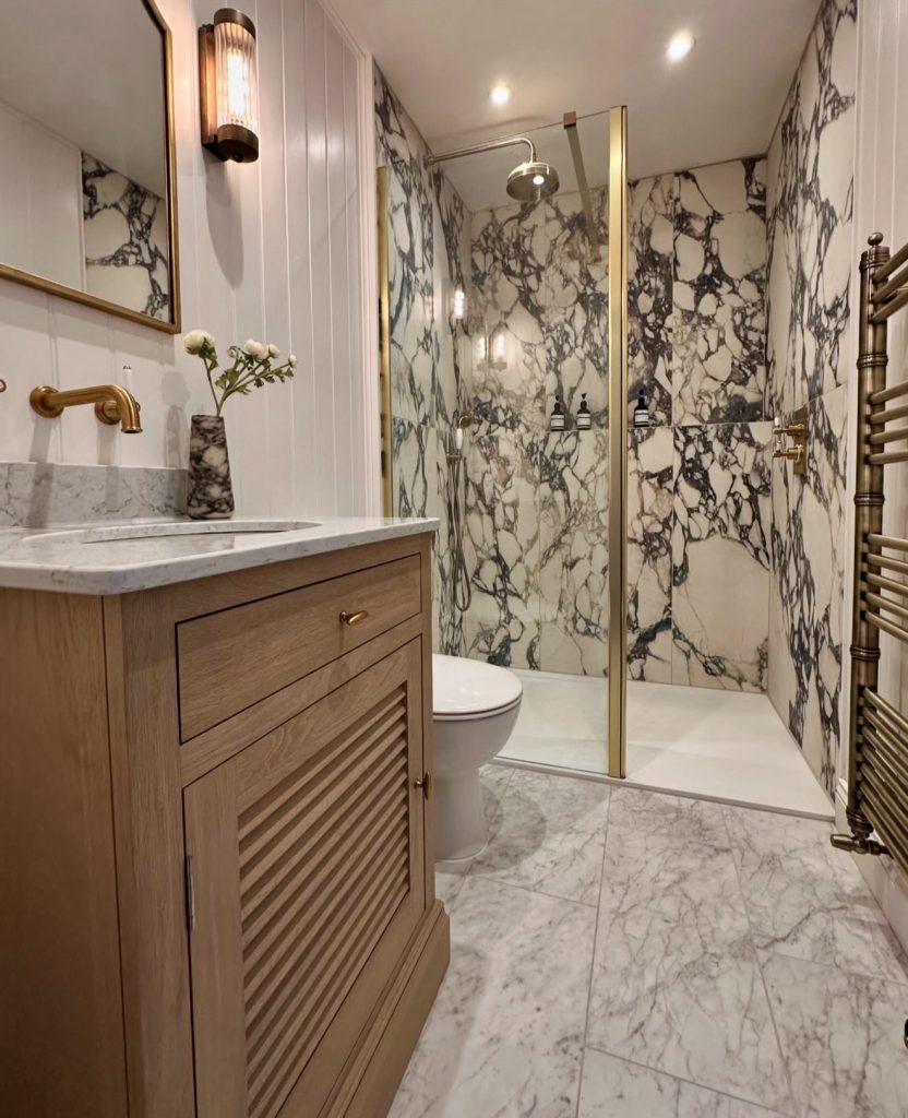 This compact bathroom uses dramatic veined marble to create a luxurious backdrop that instantly elevates small-space design. The walk-in shower is a beautiful example of walk-in shower ideas, using a bold pattern and warm brass framing to add richness without overwhelming the room. A light wood vanity softens the strong stone and ties into 2026 trends centered around natural materials and elegant decor ideas. The thoughtful layout keeps all elements tightly integrated, proving that even a small footprint can feel high-end with the right finishes. This space works well for homeowners planning a renovation that embraces both texture and timeless appeal.