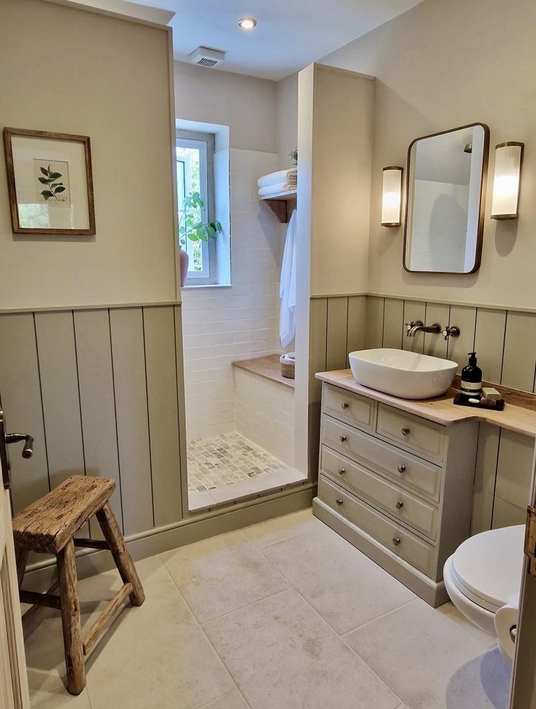 This serene bathroom highlights warm neutrals and gentle paneling that create a spa-like retreat perfect for modern small-home ideas. The built-in shower nook demonstrates a smart layout, especially for maximizing comfort in full bathrooms with limited square footage. Natural wood elements and soft stone tones make this an excellent example of the farmhouse style blended with contemporary styling. The vessel sink adds personality while leaving generous counter space, which supports intuitive storage ideas for everyday essentials. This look is ideal for anyone seeking subtle design ideas that feel both calming and carefully curated.