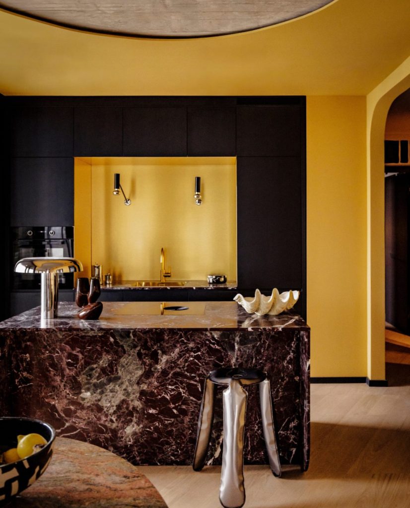 This striking design showcases how yellow kitchens can be daring and luxurious. Deep black and cabinetry frames a glowing mustard yellow niche, creating a dramatic focal point. The sculptural island in dark marble adds a sense of grandeur, while metallic fixtures and futuristic seating give the space a modern edge. This look caters to design lovers who want to make a statement—pairing yellow with grey and, navy and, or purple and accents could take it even further. It’s a perfect reminder that yellow isn’t just for cozy spaces; it can be bold, architectural, and high fashion.