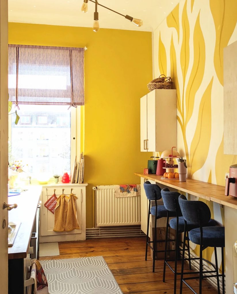 This narrow kitchen proves how yellow can completely transform a small space. Instead of focusing solely on cabinets, the designer used vibrant mustard on the walls with white cabinets, creating an energizing backdrop that pairs beautifully with the bold organic wall pattern. The contrast with deep navy seating gives the space structure, adding a touch of modern balance to the playful design. Light wood tones and natural sunlight make the color feel warm and approachable. For those who want impact without a full remodel, painting the walls is a simple way to bring inspiration and character into the kitchen.