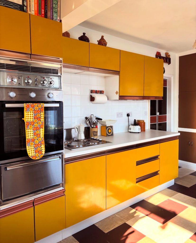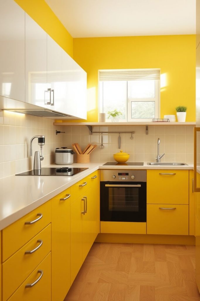 This kitchen embraces a nostalgic vintage aesthetic through glossy mustard cabinets and classic mid-century elements. The tiled backsplash, retro oven, and red and yellow accents evoke a 1970s charm, but the clean white and layout keeps it functional for today’s lifestyle. The bold floor pattern adds even more personality, giving the space a graphic punch. This look works especially well in apartments or homes with architectural character, proving that yellow kitchens can celebrate the past while fitting seamlessly into modern living.