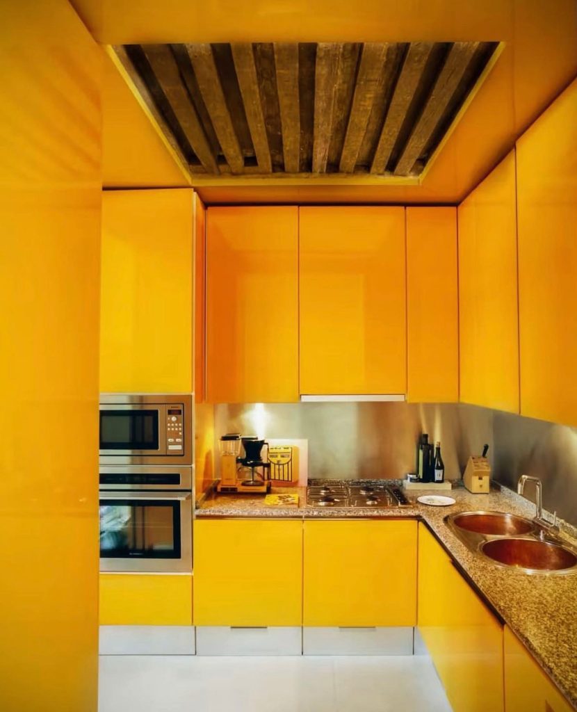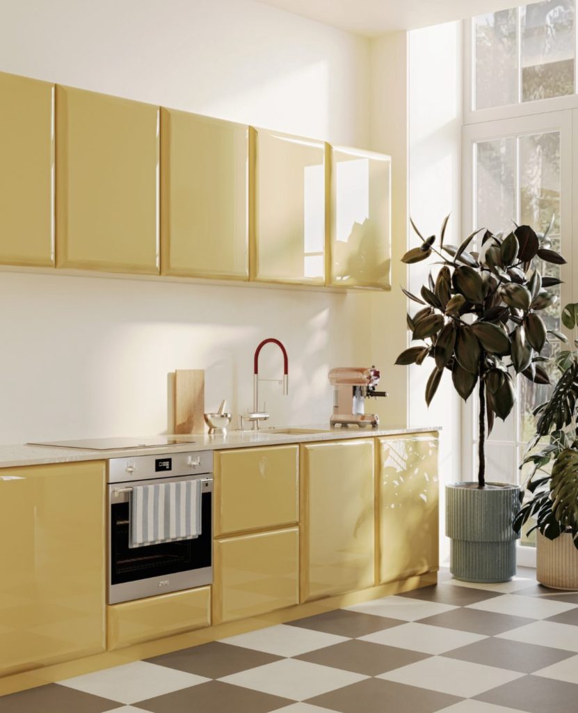 This kitchen embodies sleek minimalism with a modern twist. The glossy pale yellow cabinets reflect natural light beautifully, creating an airy, uplifting vibe that pairs seamlessly with the checkered floor for a subtle vintage nod. The streamlined layout makes it perfect for smaller apartments, proving that bold color doesn’t require clutter. The combination of white and soft yellow feels fresh and sophisticated, while the red faucet adds a playful contrast. This is a perfect example of how butter tones can feel both contemporary and timeless, giving homeowners endless styling inspiration.