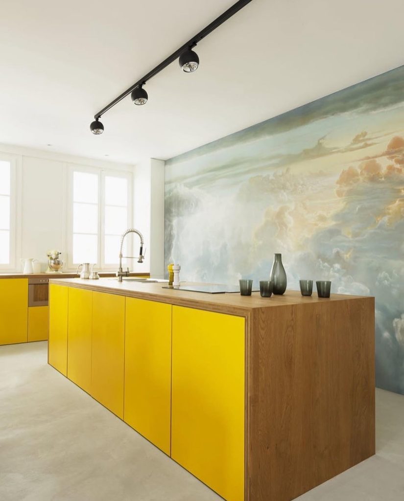 This kitchen merges bold yellow cabinets with artistic expression. The warm wooden island anchors the bright cabinetry, while a serene cloud mural on the wall adds an unexpected aesthetic twist. It’s a refreshing example of how modern kitchens can balance functionality and creativity. The minimalist track lighting keeps the focus on the cabinetry and mural, making it a conversation-worthy design. Adding blue and or green and ceramics or glassware would enhance the dreamy atmosphere even more.