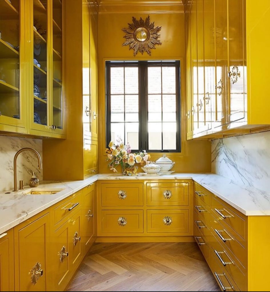 This stunning space takes mustard yellow to glamorous heights. Lacquered cabinets with ornate gold handles and marble countertops create a modern yet vintage-inspired luxury kitchen. The symmetry and detailing make the room feel like a jewel box—perfect for design enthusiasts who love a dramatic statement. The combination of white and marble with golden yellow gives the space a timeless sophistication, while the decorative accents elevate it further. This kitchen embodies confidence and craftsmanship, offering endless inspiration for those who want to make a bold, elegant statement in their home.