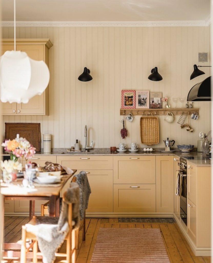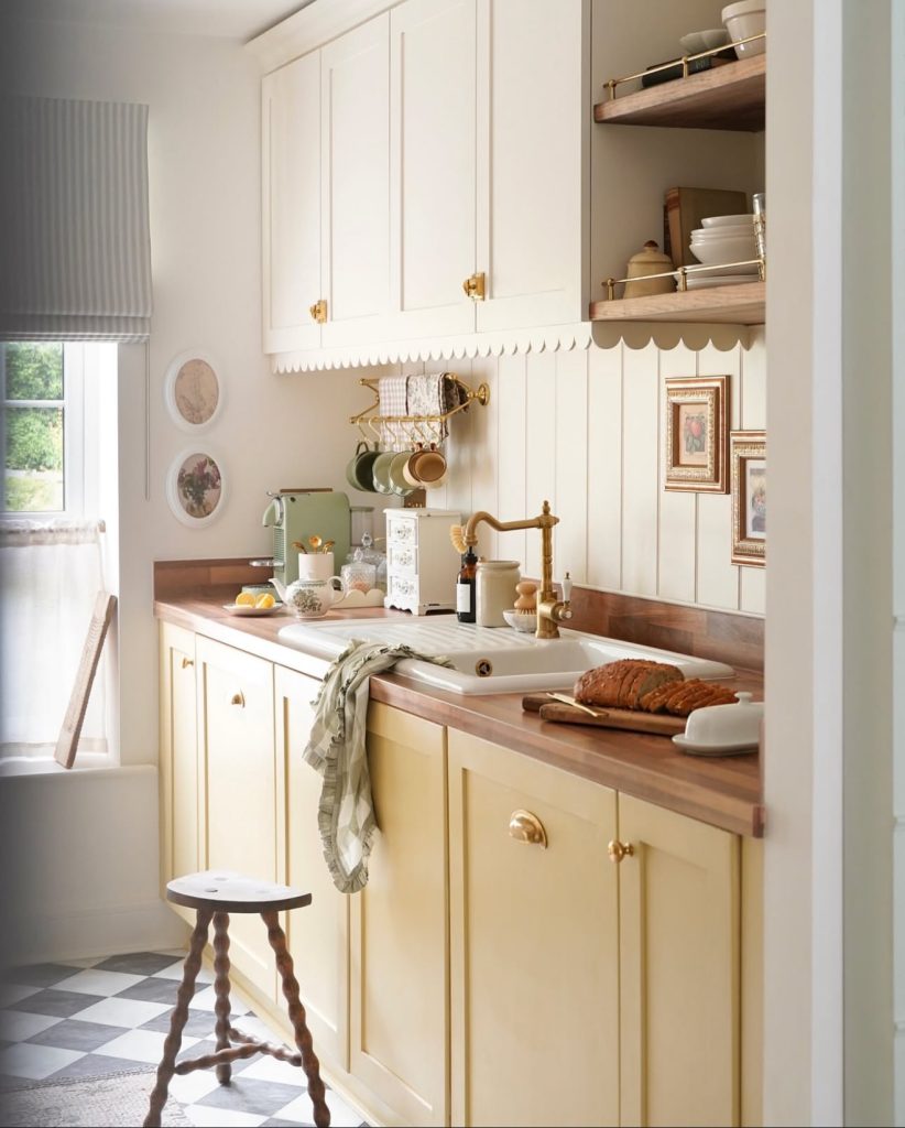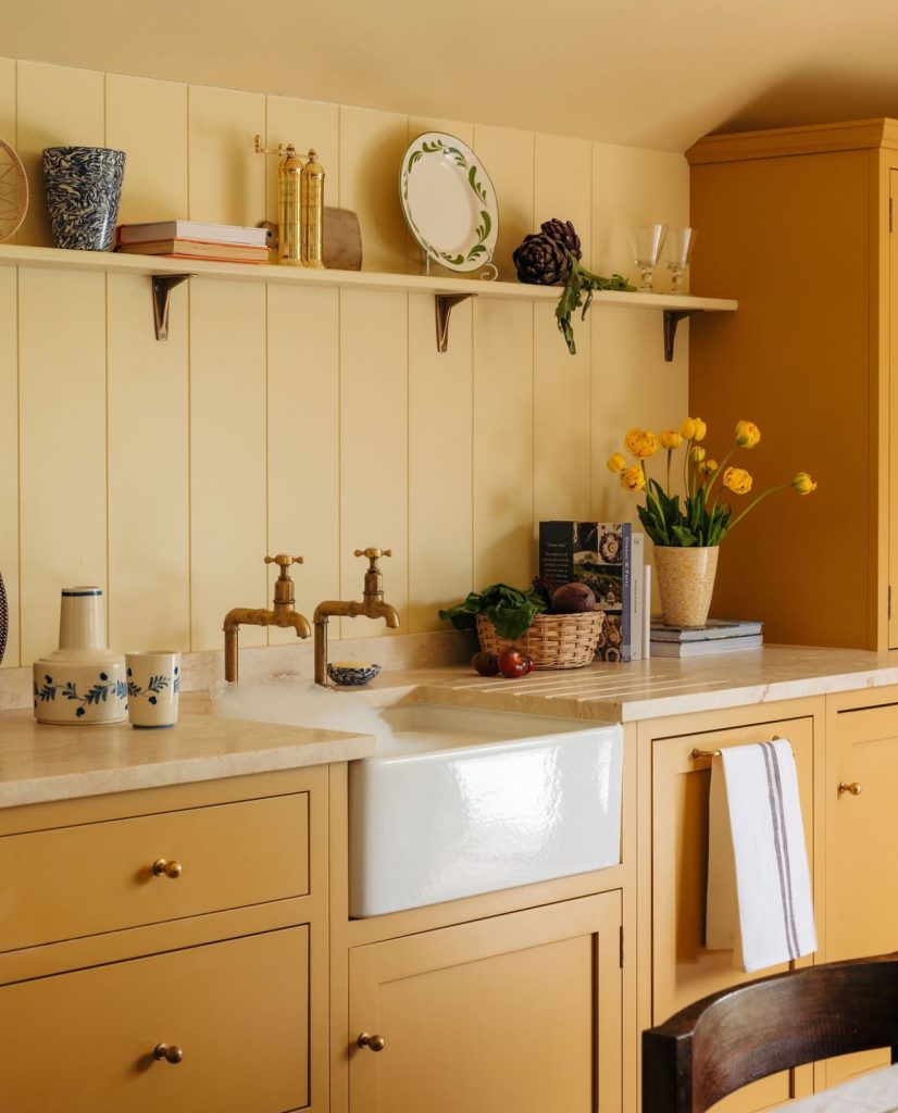 Here, pale and mustard yellows are layered thoughtfully, adding visual depth without feeling loud. The panelled walls with white cabinets, simple shelving, and classic fixtures create a soft, aesthetic balance between vintage warmth and modern comfort. Subtle touches, like ceramic mugs, floral details, and natural materials, make the space feel lived-in and authentic. Adding pink and or teal and accents through dishware or textiles could give this look even more personality without disrupting its calm atmosphere.