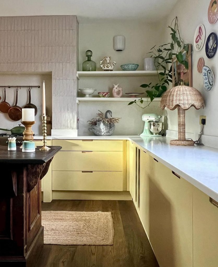 This design leans into pastel elegance with pale yellow cabinets complemented by whimsical accessories like ceramic swans, vintage glassware, and woven lamps. The layered textures — from wood floors to soft green accents — create a space that feels collected over time rather than styled all at once. This kind of kitchen reflects a personal, lived-in approach, blending modern cabinetry with nostalgic details for a truly one-of-a-kind aesthetic. Adding touches of pink and, blue and, or teal and through decorative pieces would enhance the eclectic charm even further.
