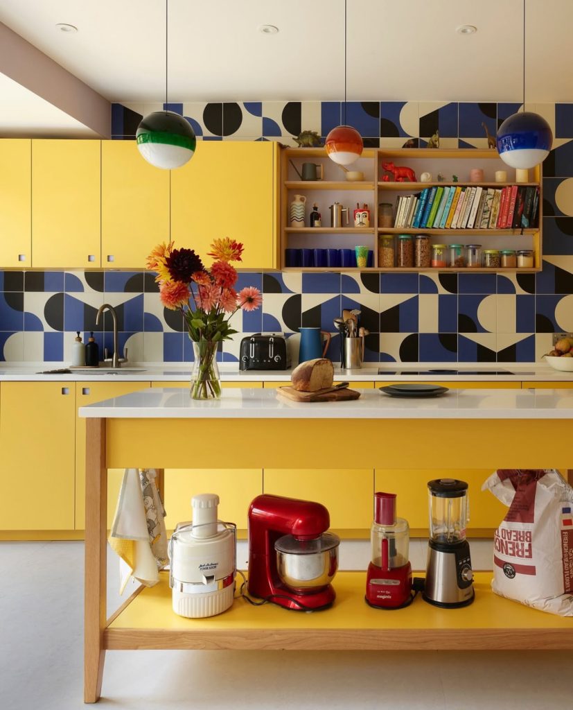 Bold and unexpected, this kitchen proves that yellow cabinets can thrive in contemporary spaces with strong graphic elements. The geometric blue and black backsplash sets a dramatic tone, while the open shelving and playful red and appliances inject personality. The island with natural wood framing softens the impact, making the overall look dynamic but balanced. It’s a vibrant design that encourages creativity and reflects a confident sense of style — perfect for those who love modern spaces with a bit of fun.