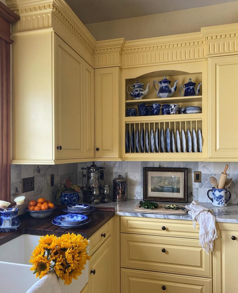 This kitchen beautifully blends blue and and pale yellow cabinetry in a style reminiscent of European country homes. The intricate molding, white and marble countertops, and curated display of china give it a distinctly vintage yet refined feel. It’s a timeless palette — blue and yellow is a pairing that decorators from Martha Stewart to traditional French designers have championed for decades. The result is a sophisticated, layered look that feels both welcoming and elegant.