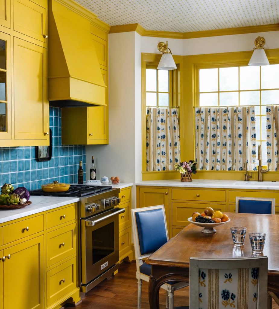 This striking kitchen uses mustard cabinets to frame the entire space, pairing them with rich blue and tiled walls for a strong, architectural aesthetic. The ceiling trim and window frames continue the yellow theme, making the color feel fully integrated rather than just an accent. Brass lighting fixtures and warm wood tones tie everything together, while vintage-style curtains soften the effect. It’s a bold but balanced design, proving that yellow kitchens can be both expressive and timeless when thoughtfully executed.