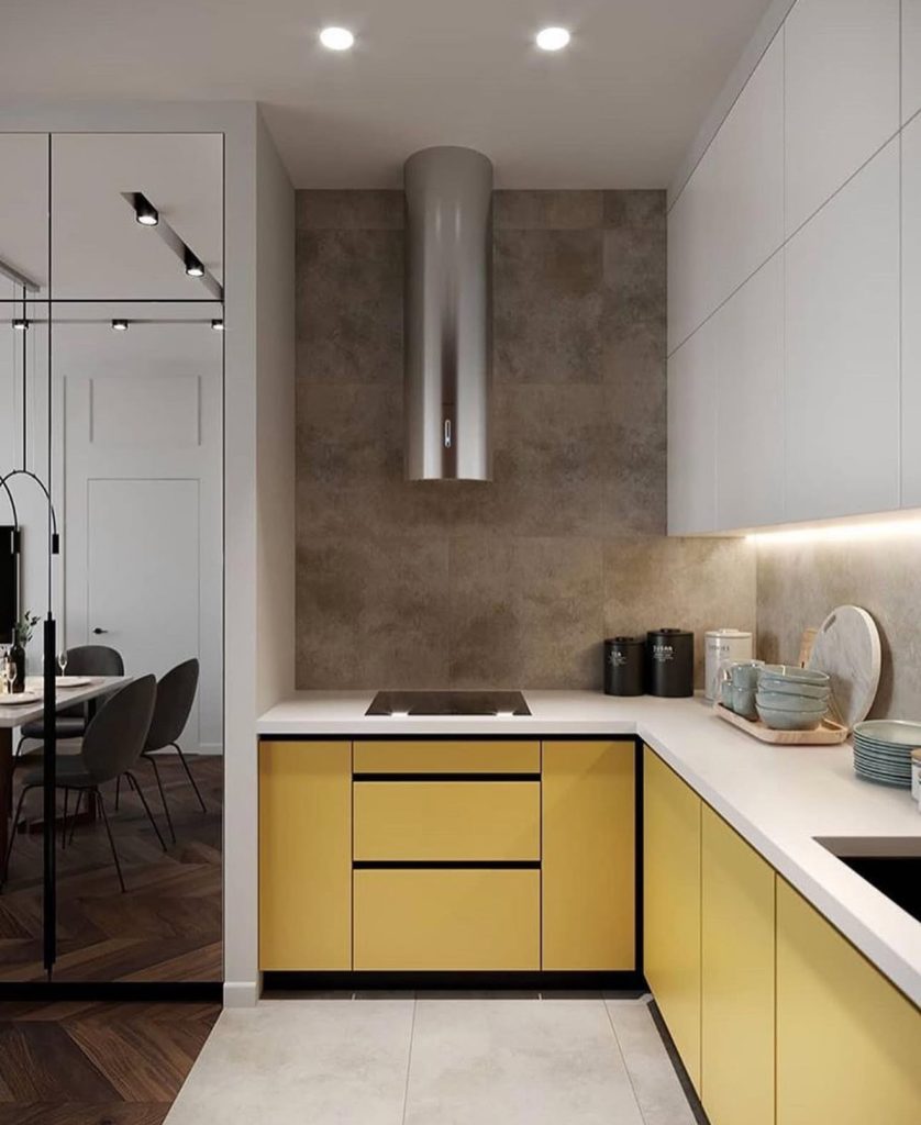 Here, yellow cabinets are used sparingly to inject brightness into a minimalist modern kitchen. Set against warm taupe walls and clean white and countertops, the soft shade feels elevated rather than overpowering. The sleek lines, built-in lighting, and mirrored surfaces give the space a polished, architectural quality. Adding grey and, black and, or even teal and accessories could easily shift the mood without changing the core design — a great example of how yellow works seamlessly in urban interiors.