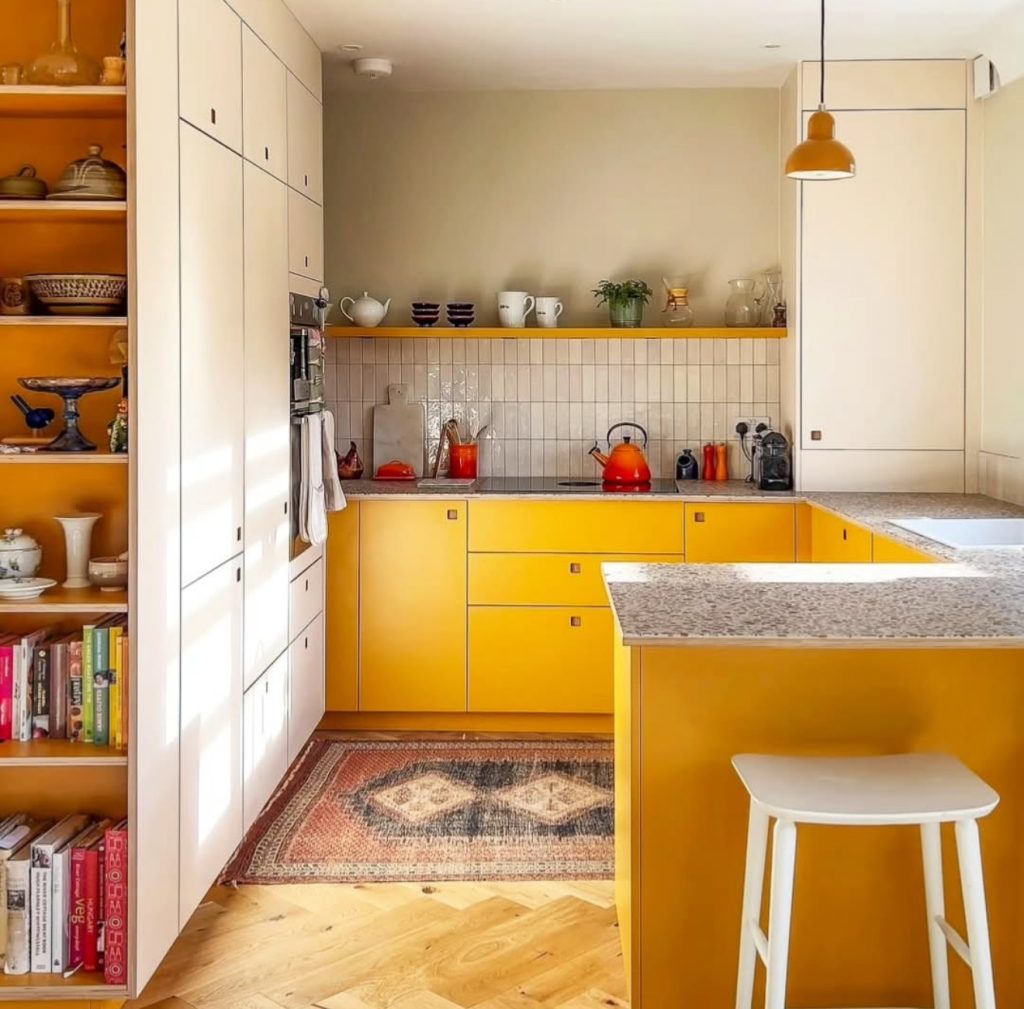 This kitchen leans fully into the playful optimism of mustard yellow. Paired with terrazzo-style counters and open shelving, it’s an unmistakably modern design with retro flair. The island doubles as a casual dining spot, perfect for city apartments where space is tight. Pops of red and orange from kitchenware give extra vibrancy, proving how bold kitchens can still be functional. Interior tastemakers like Emily Henderson often stress the value of “anchoring color with neutrals,” and this room nails it—the muted beige walls and natural wood floors temper the brightness of the cabinets, keeping the energy balanced.