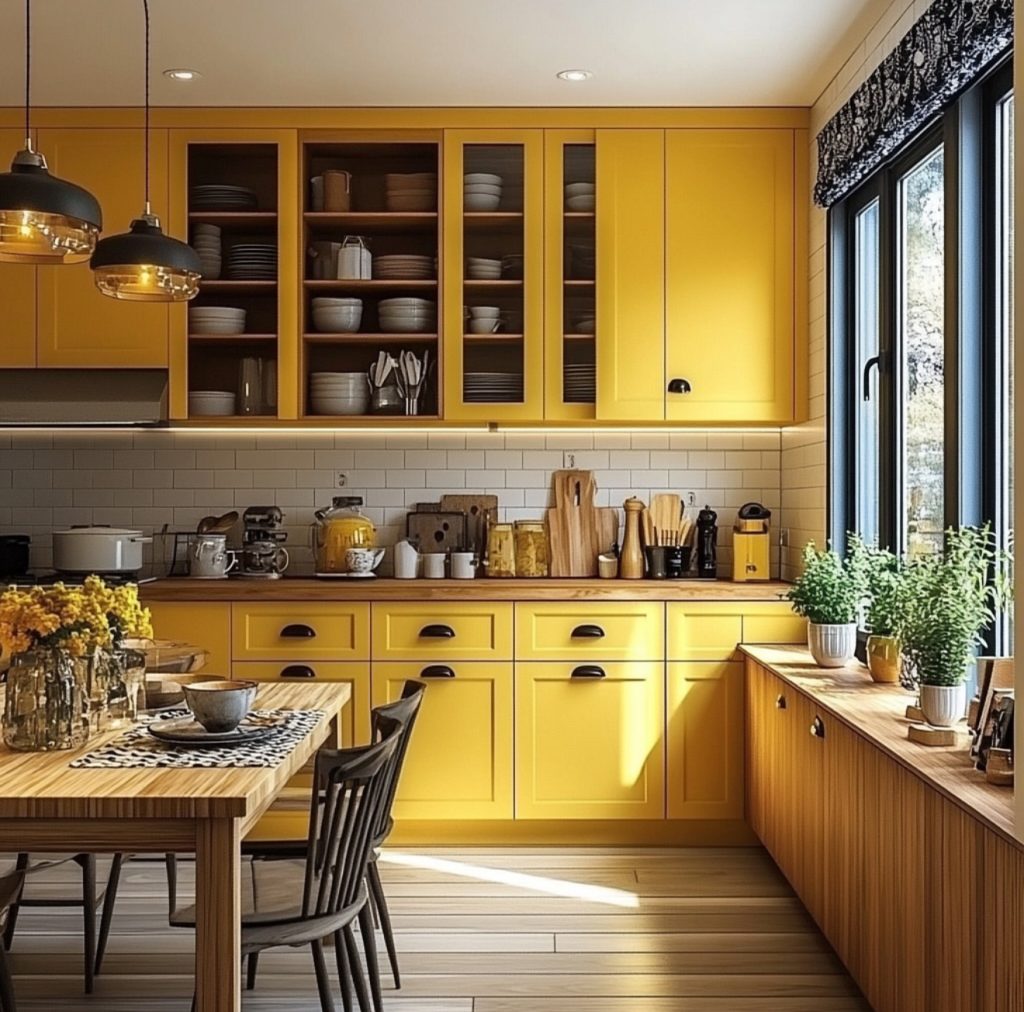 This designs pushes the aesthetic of bold kitchens by merging vivid yellow cabinets with industrial-style lighting and a blend of open and closed storage. Black handles and dark pendant lights produce a black and yellow contrast that is grounded and stylish. The wide windows pour in natural light so that the yellow does not overwhelm but stands up and shines. A dining nook with wooden chairs makes it social. This room channels anyone’s higher spirit who wants to create a cheerful kitchen with some structure. Throw in some patterned blinds or textiles in blue and teal, and it could feel multilayered and designer-curated.