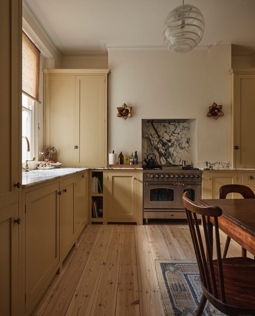 This cheerful mustard kitchen embraces natural light to the fullest. The cabinetry’s classic detailing, paired with white and backsplash tiles and warm wood floors, strikes the perfect balance between modern brightness and vintage coziness. Pops of greenery and citrus add life, while the patterned rug ties the whole look together. It’s an accessible design that works beautifully in American homes — the kind of sunny, timeless kitchen that feels like the heart of the house.