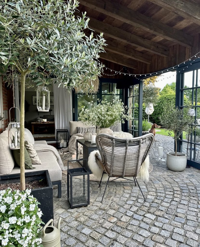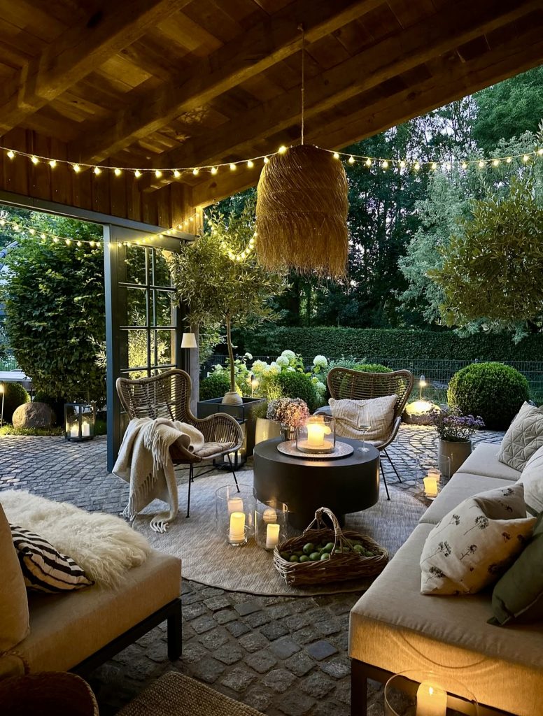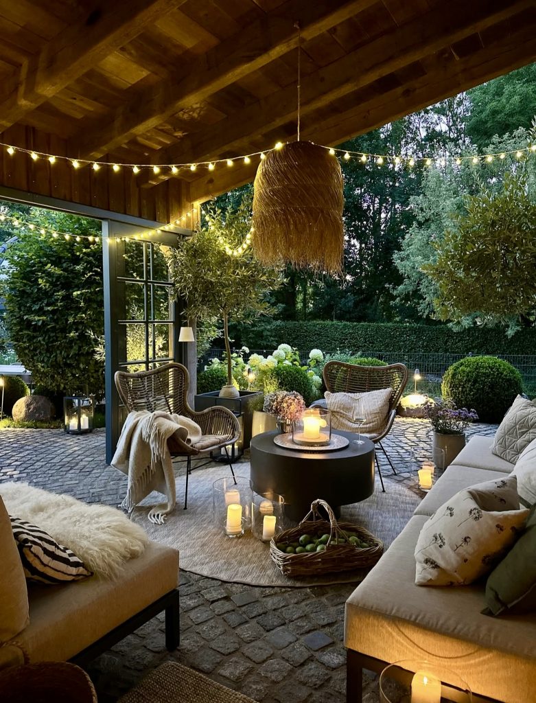 This atmospheric covered patio uses layered lighting, cobblestone flooring, and soft-textured seating to create a warm, cocoon-like outdoor retreat that effortlessly blends rustic elements with modern coziness. From its glowing lanterns to the plush throws draped over chairs, the entire layout encourages slow evenings surrounded by greenery, making it an inspiring option for homeowners seeking ideas for backyard spaces that feel intimate, grounded, and perfect for year-round relaxation.